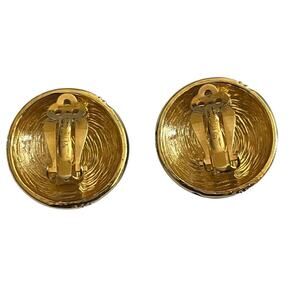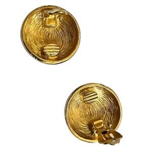 Preowned St. John round clip on earrings in a classic black and gold combination. These gorgeous earrings are large shiny black enamel clips with a bright gold rope design. The black and gold combination is a very classic and elegant look. They are a wonderful example of their high quality jewelry, the metals has been heavily plated. Signed St. John on the clips and their SJ logo on the backs.