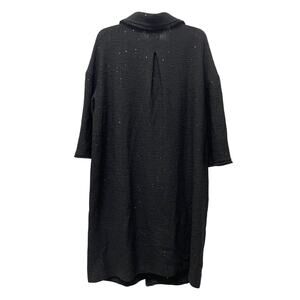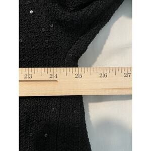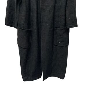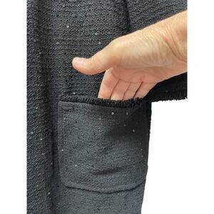 Elegant black knit coat with subtle sequin embellishments throughout for a touch of shimmer, featuring two front patch pockets with delicate fringe details.