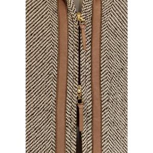 Slim cut jacket with collared v-neck and zip-front with double pulls, and leather trim.