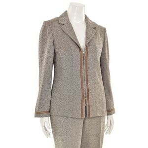 St. John Collection 3pc Leather Trimmed Pantsuit/Skirtsuit in Mocha Tweed