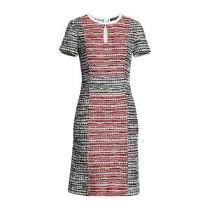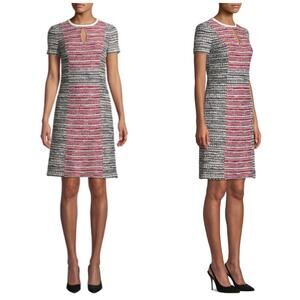 St. John Collection "Amelia" dress in colorblocked tweed. Crew neckline; keyhole front. Short sleeves. Sheath silhouette. Hem hits above knee. Hidden Zipper