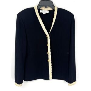 St John Collection Black Cream Trim Button Up Shoulder Pads Cardigan Sweater Jacket Blazer Wool Blend Size 6