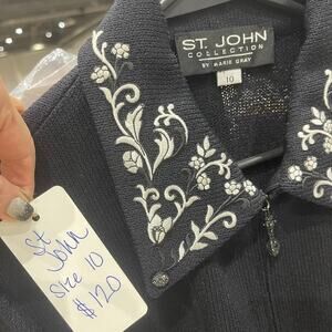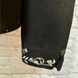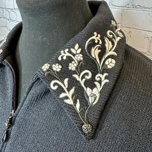 Elevate your wardrobe with this stunning St. John Collection sweater, designed by Marie Gray. This black knit zip-up features exquisite floral embroidery on the collar and cuffs, adding a touch of elegance to a classic style. Perfect for layering or wearing on its own, this versatile piece can transition from day to night effortlessly.
