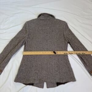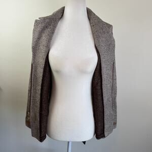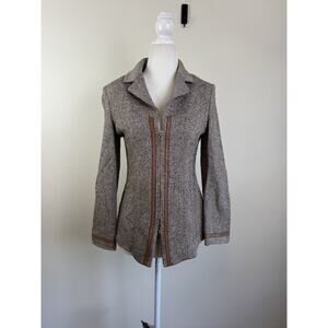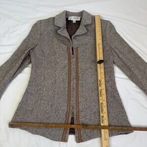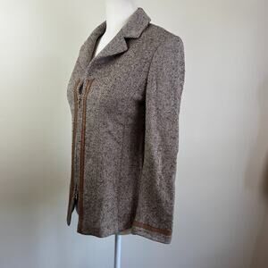 Leather trimmed wool blend zip front lightweight versatile jacket. Leather is super soft. Sleeves are trimmed in leather and have no buttons or zip.