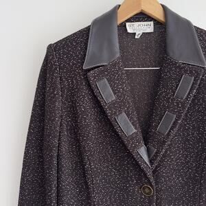 St John Collection Blazer Womens 12 Boucle Knit Button Front Leather Trim Jacket