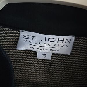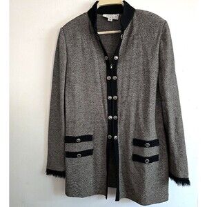 St John Collection By Marie Gray Womens workwear jacket/blazer. Made with 80% Wool, Long in length. Jacket has gold button accents faux fur lining on the wrists of the jacket. It is a zipper closure with gold button accents. Beautiful, stunning jacket, ready to wear!