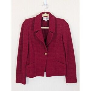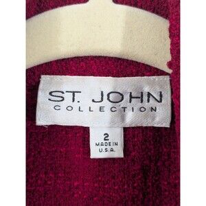 The St John Collection Knit Button Up Red Tweed Jacket Blazer in size 2 features a luxurious red tweed fabric with gold buttons, making it a sophisticated and stylish addition to any wardrobe. This classic blazer boasts a collared neckline, pockets for added convenience, and is perfect for various occasions such as designer events, holiday parties, cocktail attire, or even as a wedding guest outfit. Made for the winter, fall, and spring seasons, this blazer exudes elegance and timeless style for the modern woman.