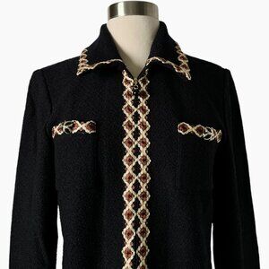 Keywords: St. John Collection, St John Collection, St. John jacket, St John blazer, embellished knit jacket, embroidered trim jacket, longline knit blazer, black designer jacket, luxury knitwear, St. John by Marie Gray, textured knit jacket, classic black blazer, evening jacket, professional blazer, made in USA jacket, timeless luxury jacket, fall layering blazer, elegant dinner jacket, statement trim jacket, couture knitwear