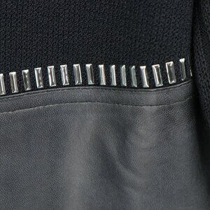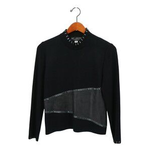 St. John Collection Leather Patch Studded Black Santana Knit Sweater Size: 4 Leather patch over the front Silver rectangle stud detail Zipper down side of mock neck-top of shoulder Care: Professional leather clean only In excellent condition! Approx. Measurements: Length: 20.25" down from back base of neck Across underarms: 17.75" Shoulder seam to end of sleeve: 21.75" D4