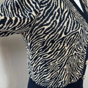 Elegant knit cardigan by St. John Collection by Marie Gray, featuring a bold zebra print in a sophisticated color palette. This classic piece is designed with a flattering V-neckline and a button-down front adorned with decorative gold buttons that enhance its luxurious feel. The 3/4 sleeve cardigan is structured with subtle shoulder padding for a refined silhouette and finished with a ribbed hem and cuffs, adding textural contrast and ensuring a comfortable fit. A versatile and timeless addition to any wardrobe, perfect for layering or wearing as a standalone top.