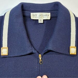 St John Collection Navy Blue Zip Jacket Knit Sz 12 White Ribbon Trim Gold Buckle
