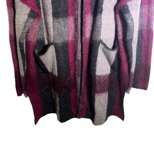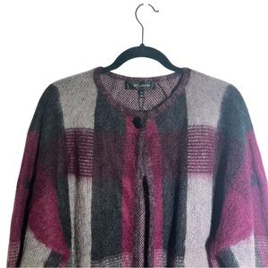 Red and gray, mohair blend, plaid cardigan style knit jacket. Has single, leather coated, button closure at neck. Has front patch pockets, side slits and dropped sleeves.