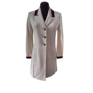 This stunning St. John Collection set includes a long-line Santana knit jacket paired with the matching sleeveless shell, both in a classic cream tone with striking black and red trim details. The jacket features ornate silver-tone buttons and tailored seaming for a flattering silhouette. The shell mirrors the jacket’s specialty trim at the neckline, making this a perfectly coordinated luxury set ideal for work, events, or polished everyday wear.