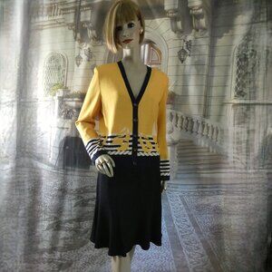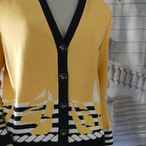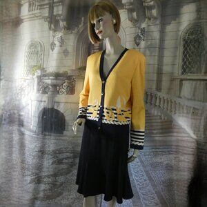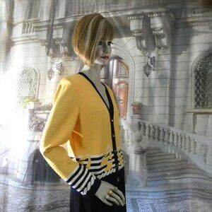 Condition – Excellent condition – beautiful sailboats in a rich yellow long sleeved jacket with white and dark blue ropes and other sailing elements – five center front dark blue metal signature SJ buttons rimmed in gold – the skirt is St. John Basics in dark blue in the traditional vertical Santana Knit – the skirt is gored and very flattering – the dark blue of the skirt may be slightly darker than the blue in the jacket depending on the light – it looks the same in normal light - please scroll down for measurements.