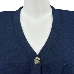 St John Collection Sweater Womens 8 Navy Gold Buttons Cardigan Shoulder Pads Pockets Santana Knit Button Up 3/4 Sleeves V-Neck Mature Wool Rayon Office Work Corporate Made in USA Old Money Heritage Quiet Luxury