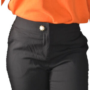 St. John Collection wool pants FEATURE tuxedo style velvet trim down the outer side seam. Mid rise waist. Straight legs. Cropped ankle length. Button closure. Ornate imitation pearl button. Made in USA.