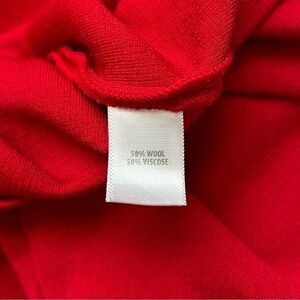 This cap sleeve boat-neck red knit blouse from St John Collection in wool blend cherry red features a semi fitted silhouette with short cap sleeves and a rounded bateau neckline. 50% wool, 50% viscose