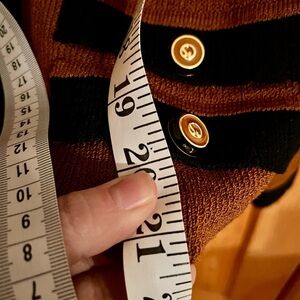Elevate your wardrobe with this elegant St. John jacket. Featuring a rich brown color with black trim, this piece is perfect for any occasion. Experience the luxury and style of St. John. The cardigan buttons with gold buttons and it is a size small and does have shoulder pads. Shoulder to hem is about 21.5 and pit to pit is about 19. This jacket is vintage but has no visible flaws. Also the waist measures about 17.5.