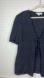 Solid black knit cardigan with cute double tie front and short sleeves. Crochet panels on sleeve hems and bottom hem for added interest. String ties for front closure have black and gold beads and allow you to adjust fit. The beads are metal and glass or resin and have some nice weight to them. V neckline and shoulder pads.