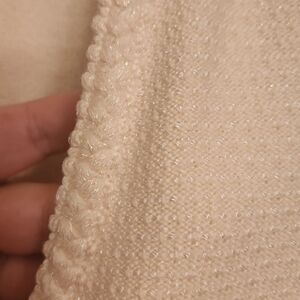 There are 3 spots (right sleeve and right lower pocket) that look like they have a mark/stain, but that is not what they are. Each spot has a tiny gold thread that was somehow sewn in with the cream (no idea why). These threads have been tucked in to minimize them, but I wanted to point them out