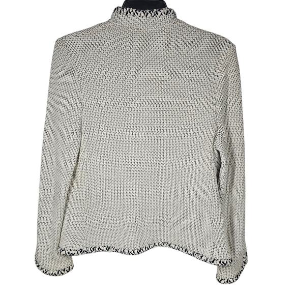 The jacket features a stand-up collar and a full zipper. The black and cream tweed is accented with a braided chenille trim along the collar, the zipper, and around the patch pockets. This jacket is a great color because it can be so versatile. It can be dressed up or dressed down, and can be worn alone or over a blouse.