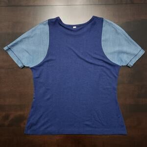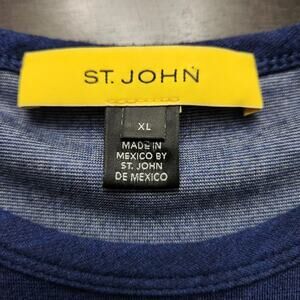 St. John Color Block Short Sleeve Top in great pre-loved condition! Classic tee style in shades of blue with St. John logo on back near the collar as photographed.