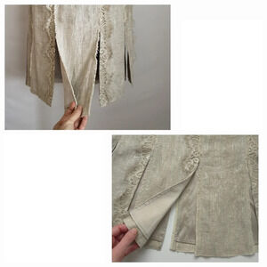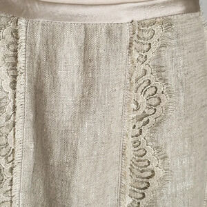 Slit panels on front and back. Beige linen with beige lace appliques. Satin waistband. Full lining.
