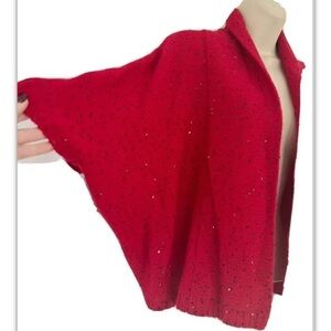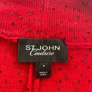 St. John Couture woman's red open front dolman short sleeve sweater. Sweater has small black sequin detailing throughout. It's made of a cashmere cashwool blend and is a woman's St. John size P which translates to a woman's size 2.