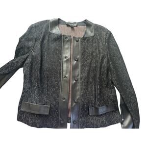 St John Couture Tweed wool Blazer Jacket Size 12 Black Leather Trim button Knit