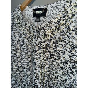 ST JOHN Couture Women's White Black Boucle Gold Studs Throughout Shimmer Knit Tweed Jacket. It’s fully lined, and has a hook and eye closure.
