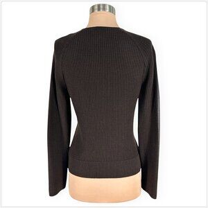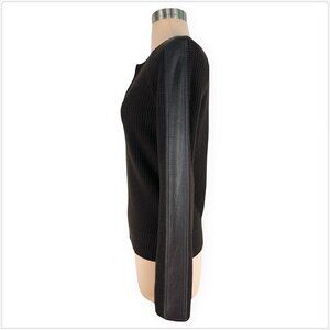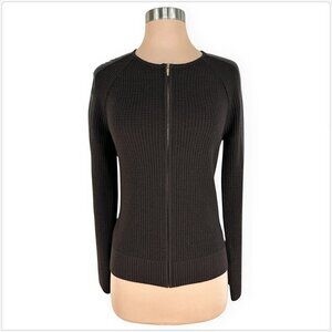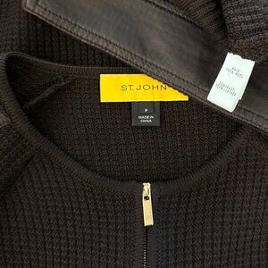 St. John Dark Brown Waffle Knit Zip Front 100% Leather Trim Sleeves Cardigan P