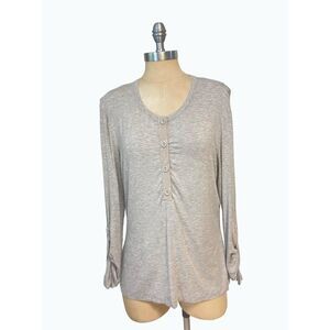 Experience the luxury and style of the St John Designer Gray Henley Long Sleeve Top in large size. This top offers a perfect blend of comfort and high-end fashion, making it a must-have for your wardrobe.