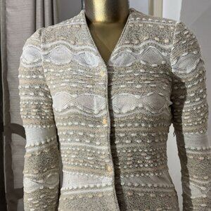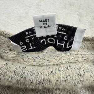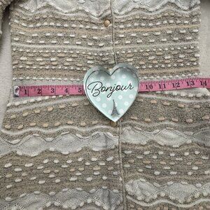 This elegant women's sweater features a sophisticated cream and greige color pattern, perfect for any occasion. Its stylish design offers both comfort and fashion. It is warm. It is a bit fuzzy based on wear. There is a small stain (I think it will come out with a dry cleaning) on the back of the left arm near the end of the sleeve. The measurements are: pit to pit is 15 inches, waist is 14 inches, length is 28 inches, sleeve length is approx 24 inches. This fits like an XS in my opinion. And, yes, there is some stretch to it. I usually wear a size 2 or 4 and this fits snug on me.