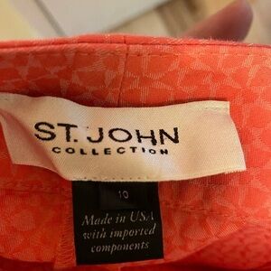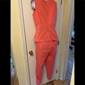 St John Emma pant with matching sleeveless peplum top in beautiful summertime coral. Emma Fit – A cropped ankle pant with a medium rise that sits 1” below the waist and tapers at the hem.