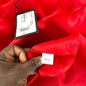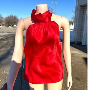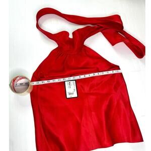 New with tag women’s silk halter neck blouse in a vibrant red color. Pictures taken indoors and outdoors to show true color. Measurements in pictures.