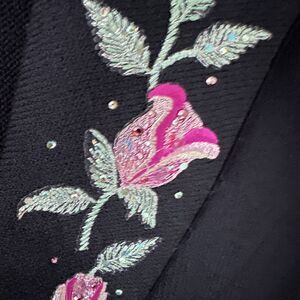 ✔ Style: Blazer cardigan, open front or button front (confirm), embroidered floral detailing, elegant evening wear