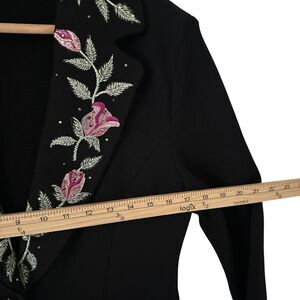 Elevate your evening look with this stunning St. John Evening black blazer cardigan adorned with delicate embroidered flowers. This elegant piece combines the structure of a blazer with the softness of a knit cardigan, perfect for pairing with dress pants or over a chic dress for formal events or dinner parties.