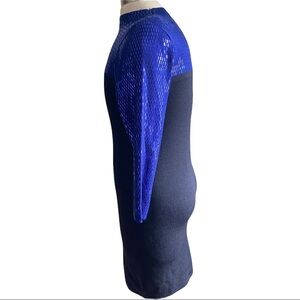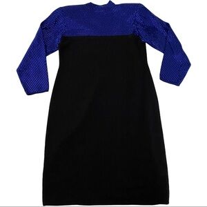 Vintage 1980s St. Saint John Sexy Romantic Mini Evening Dress Cocktail Dress Event Dress Wedding Sweater Knit Black Body with Cobalt Blue Sequins Zips at the Neck. This dress is absolutely gorgeous. I highlighted 3 missing sequins, almost unnoticeable. This dress is preowned, vintage, amazing, and in great condition. I feel comfortable that this dress is a Medium or a 10, as there is no size tag.