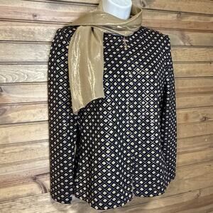 The St. John Evening by Marie Gray Black and Gold Knit Jacket in women’s size 2 is a luxurious and stylish outerwear piece perfect for formal events, holiday parties, or business functions. Made from soft cotton knit fabric with a checkered pattern, this short jacket features embellished accents such as paillettes, rhinestones, and a matching St. John silk and metallic polyester scarf, adding a touch of glamour to any outfit. Details such as the gold toned zipper pull with golden rhinestone embellishments, exude timeless beauty. The black and gold color scheme and collarless design give it a sophisticated and classic look, while the 3/4 zipper closure and regular fit make it comfortable and easy to wear. Ideal for all seasons, this designer jacket exudes elegance and timeless style. Pre-loved in great condition. Please view all photos.