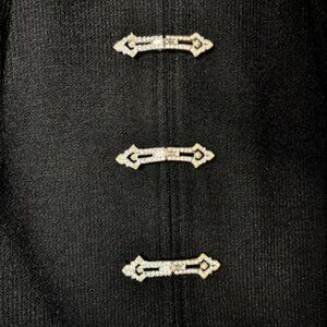 Elevate your wardrobe with this stunning St. John Evening jacket, featuring signature sophistication and eye-catching sparkle. The black Santana knit is beautifully accented with a silver crystal-embellished collar and cuffs, plus ornate rhinestone hook-and-eye closures down the front. A true statement piece for holiday parties, evenings out, or any special occasion.