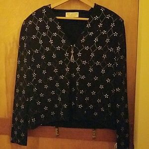 This gorgeous, pre-owned St. John jacket has only been worn twice. It is a cropped jacket with a zipper front. The item has light shoulder padding, paillettes and metallic detailing, and an embellished zipper pull. It is in excellent condition. It was purchased as a size 14, but had minor alterations done by a professional tailor at Nordstrom at time of purchase.