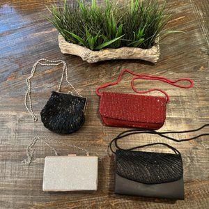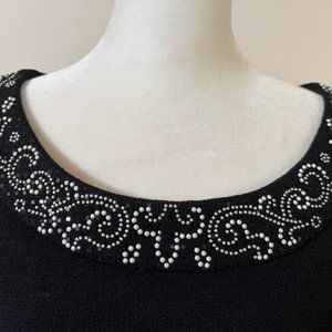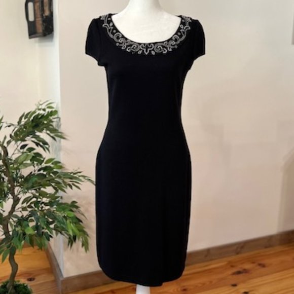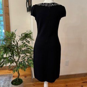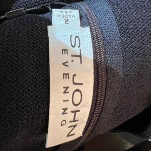 This is THE CLASSIC St. John knit evening sheath dress! It's dark navy, size 2, and has gorgeous detailing around the collar (front and back!) with chalk beading and small, subtle dark navy square sequins. This dress was worn once for a black tie event and is perfect, no flaws or wear. Offering free shipping plus a gift of your choice of one of the small clutch evening bags (black beaded, red or silver) as long as they last. I'm listing quite a few LBD's today!!
