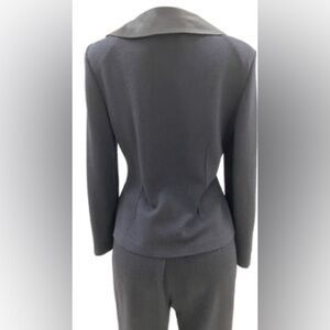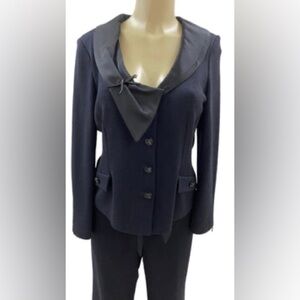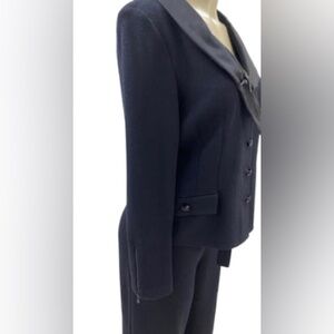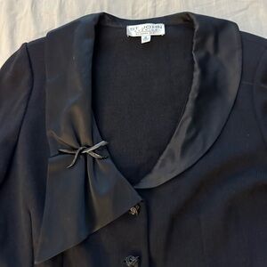 St. John Evening by Marie Gray jacket. Black colored knit sweater body, with zippers on sleeve ends, and square pockets on the front. Buttons are black enamel, black rhinestone. There are shoulder pads. The collar is made out of silk/satin and features a mini pleat embellishment. Size 10.