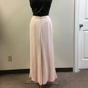 100% silk pink trousers. Never worn - perfect condition. Leg slit from knee down with beautiful pleating embellishment. Lining is 95% silk, 5% spandex
