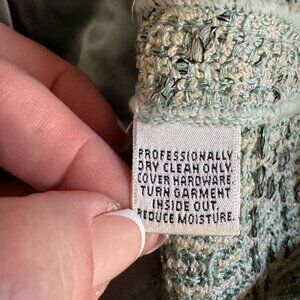 Crafted from a delicate tweed fabric, this St. John Evening cardigan exudes timeless elegance. The soft blue and silver hues shimmer subtly, while the tie closure accentuates the waistline beautifully. Perfectly tailored for sophistication, it’s a versatile piece for layering over ensembles, ensuring a polished and graceful appearance.