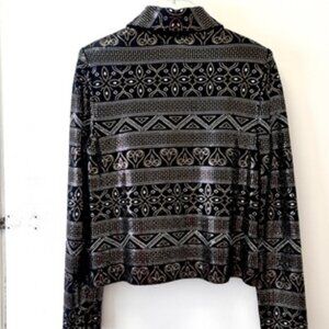Turn heads in this stunning St. John Evening jacket featuring intricate gold, silver, and crystal embellishments on a classic black knit. The elevated design, paired with a beautiful jeweled zipper pull, makes this jacket perfect for special events, evening wear, or adding sophisticated sparkle to any outfit.