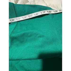 St. John Green heavy knit green sweater v neck gold button front sailboat logo does have some stains and wholes on it shown in pictures size P measurements included.