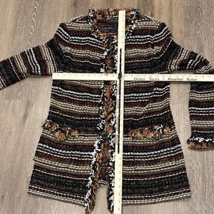 St John Jacket Size 12 Tweed Fringe Long Boucle Knit Open Front Pockets Cardigan