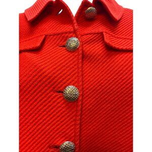 This elegant St. John cropped jacket features an eye-catching red hue with textured fabric and distinguished button details. Its sophisticated design is ideal for professional settings, providing a blend of style and comfort.