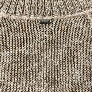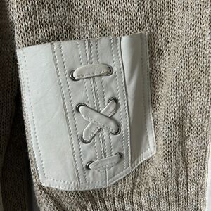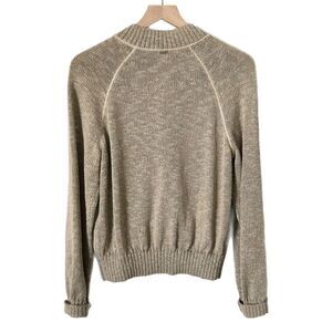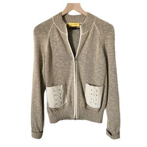 St. John Knit Zip Up Cardigan Tan Linen Silk Wool Blend Leather Pockets Size Med